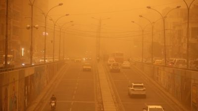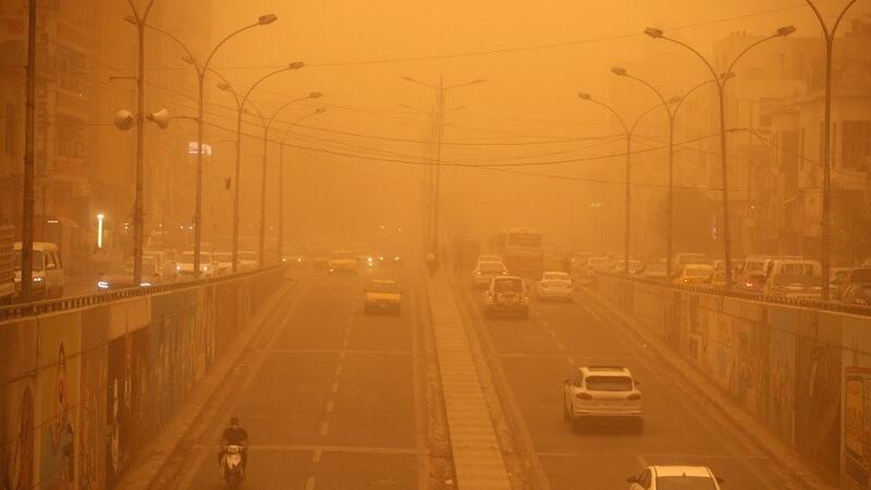 وتتعرض أنحاء العراق الأحد لعاصفة ترابية هي السادسة خلال شهر، أدت إلى إغلاق مطاري بغداد والنجف الدوليين في ظاهرة يزداد تكرارها.