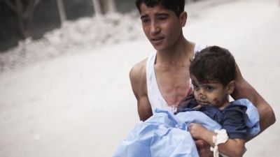 شاب يسعف شقيقه الذي اصيب بقصف القوات النظامية على احد احيار حلب