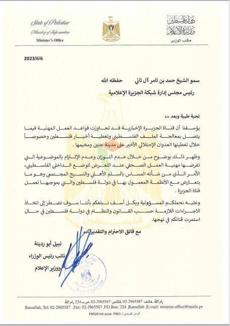 وقال الكتاب الموجه الى الشيخ حمد بن ثامر آل ثاني رئيس مجلس ادارة شبكة الجزيرة الاعلامية ان تغطية القناة الخاصة باخبار فلسطين وخصوصا فيما يتعلق بالعدوان الاسرائيلي الاخير على مدينة جنين ومخيمها خرج عن القواعد المهنية