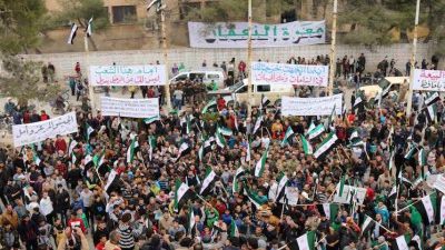 وقال الإدلبي “دعينا الناس اليوم لتظاهرة بمدينة إدلب عند الساعة 15،00 (13,00 ت غ)، ظنا منا بأننا سنعيد إحياء الحراك الشعبي في المدينة”.