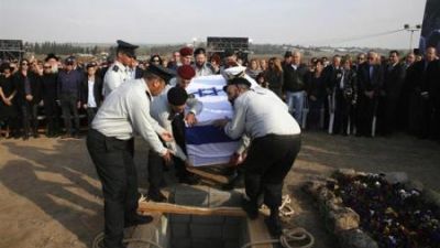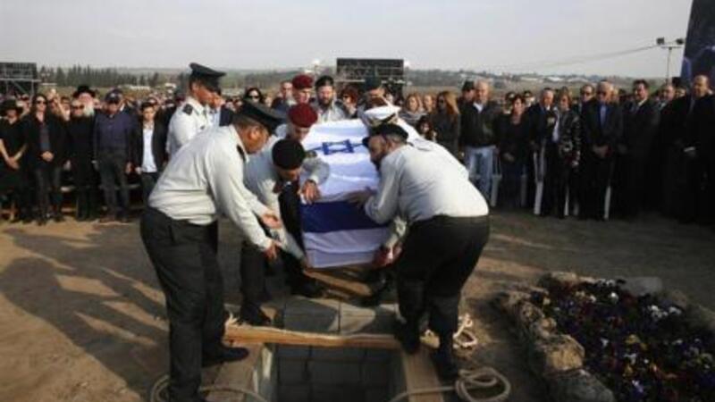وقال الرئيس الاسرائيلي شمعون بيريس من القدس بينما كان نعش شارون ملفوفا بعلم اسرائيل "نجتمع اليوم لنواري جثمان جنديا الثرى .. كان جنديا استثنائيا .. قائدا كان يعرف كيف ينتصر."
