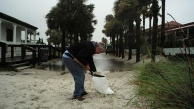 رجل يحضر كيس رمل تحسبا من الاعصار ماثيو، في جاكسونفيل بولاية فلوريدا، الخميس