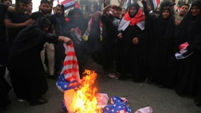 وخلال الاحتجاجات في بغداد والنجف والبصرة، تم ترداد هتافات ضد بريطانيا وفرنسا. واحرقت اعلام اميركية واسرائيلية في البصرة حيث رفعت صور للرئيس الاميركي دونالد ترامب عليها صليب احمر كبير.