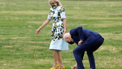 President Biden picks a dandelion for first lady Jill Biden while walking to Marine One as they depart for Atlanta to promote his plans to rebuild the US economy and mark his 100th day in office.