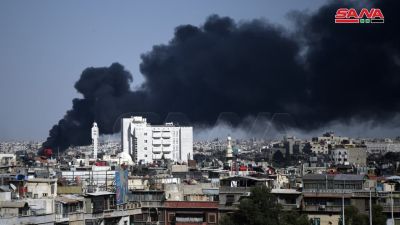واشارت وكالة الانباء الرسمية السورية الى سبب الحريق معلله اشتعال نيران في خزان مازوت بكراج في منطقة الصناعة.