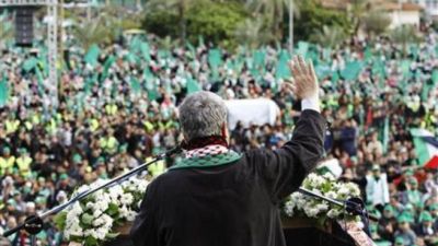 وخرج مشعل عبر أبواب نموذج لصاروخ ضخم على المسرح المقام أمام التجمع ملوحا بذراعيه ومشيرا بعلامة النصر في الوقت الذي أطلقت فيه الحشود صيحات التأييد بمجرد ظهور زعيمهم الذي قضى فترة طويلة في المنفى.
