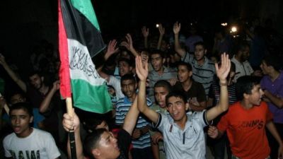 مناصرو حماس يحتفلون بالاتفاق على صفقة اطلاق سراح الف اسير فلسطيني مقابل اطلاق سراح الجندي الاسرائيلي جلعاد شاليط