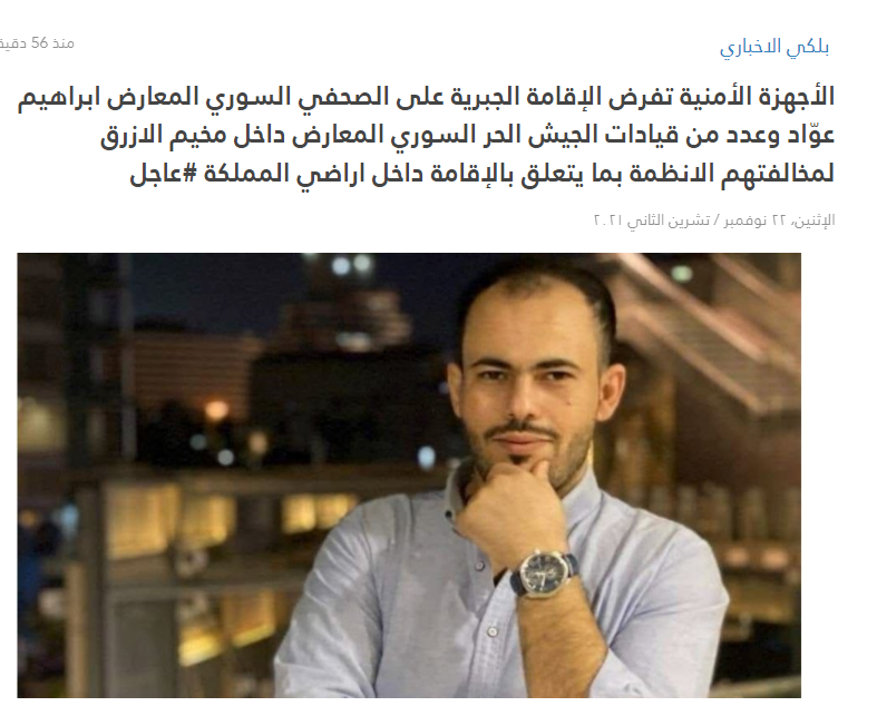 ووفق التقارير فقد اقتحمت الاجهزة الامنية الاردنية منزل الصحفي ابراهيم عواد في عمان واقتادته الى مخيم الازرق للاجئين السوريين فيما لم يعرف مصير زوجته وطفليه