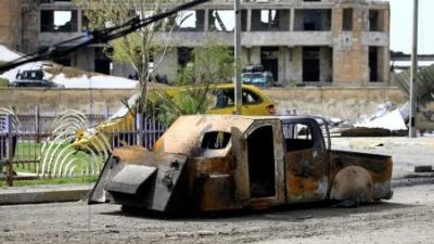 حطام مركبة مفخخة تابعة لمقاتلين من تنظيم الدولة الإسلامية في الموصل
