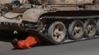 وبعدها ظهر عنصر قوات النظام وهو مكبل ويقف في وسط شارع وقد أحاط به عدد من عناصر التنظيم ومن أمامه دبابة تتقدم نحوه، ليقوم سائق الدبابة بدهسه وإكمال طريقه بالدبابة فوق الجثة، وفق بيان المرصد.(النهار)