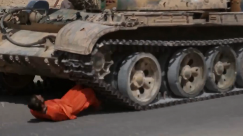 وأظهر الشريط المصور بعدها "عنصراً من تنظيم "الدولة الإسلامية" يقف خلف عنصر قوات النظام وقال "إن هذا المرتد النصيري النجس قد دعس إخواننا وهم أموات بالدبابة لذلك تقرر أن يدعس بالدبابة وهو حي"