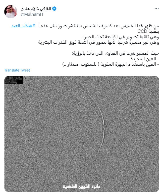 ثبوت رؤية هلال شهر شوال من #مرصد_تمير اليوم الخميس في المملكة، وبذلك يكون الجمعة، أوّل أيام عيد الفطر في السعودية.