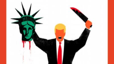 ويظهر الرسم الكارتوني تشخيصاً لترامب، وفي أحد يديه سكين ملطخ بالدماء وفي اليد الأخرى رأس التمثال وهو يقطر دماً. وكتب معها تعليق “أمريكا أولاً”.