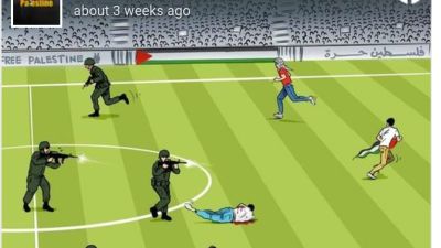 واسقط حجاج المواجهات اليومية للفلسطينيين مع قوات الاحتلال على مناسبة مونديال قطر، ووازى بين عمليات الكر والفر والجري في فلسطين المحتلة، مع مطاردة لاعبي العالم للكرة ، الا انه حول المشهد الى فريق اسرائيلي قاتل واخر فلسطيني ضحية وشهيد وجريح.