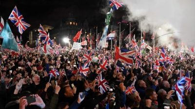 وما أن تحقّق بريكست حتى بدأت حشود من البريطانيين احتفالات أمام البرلمان في ويستمنستر.
