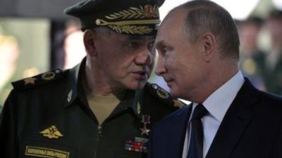 وزير الدفاع الروسي سيرجي شويجو (الى اليسار) يتحدث الى الرئيس فلاديمير بوتين