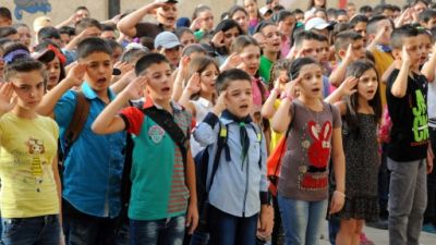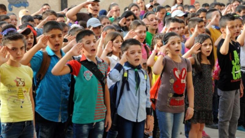 تلامذة يرددون النشيد الوطني في اول يوم دراسي في دمشق