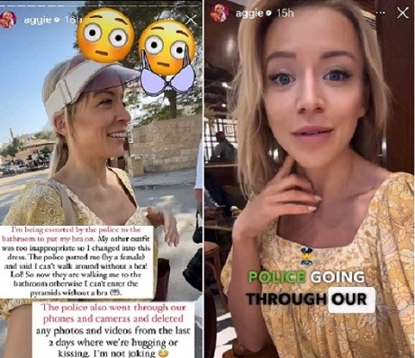 السائحة التي تبين انها مدونة أميركية شهيرة تدعى "آغي" Aggie، كانت قامت ببث مباشر عبر حسابها في انستغرام للحظات التي تلت اقتيادها من قبل رجل الامن من اجل اجبارها على ارتداء ملابسها.