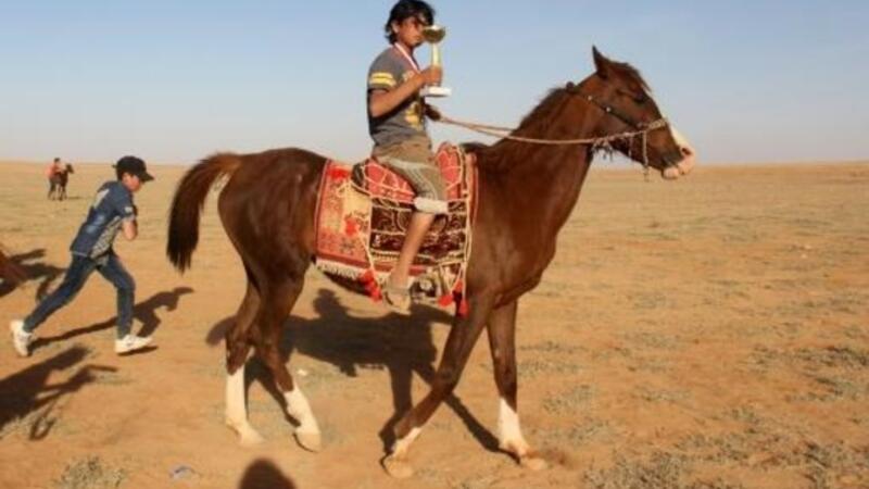 من على صهوة فرسه الشقراء "شمس"، يرفع الفتى منذر جحجاح كأساً ذهبياً فاز به في نهاية سباق نادر للخيول العربية أقيم في منطقة تحت سيطرة الفصائل المعارضة في شمال سوريا رغم الحرب التي دخلت عامها السابع.