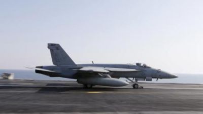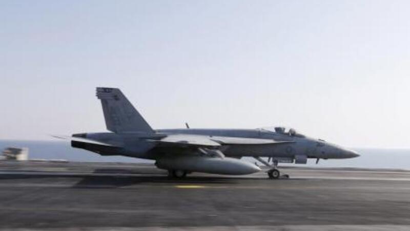 مقاتلة من طراز إف-إيه 18 إي/إف سوبر هورنت قبل اقلاعها من على حاملة الطائرات الأمريكية ثيودور روزفلت في الخليج
