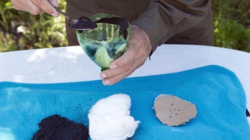 يقص عبوة العصير البلاستيكية عشرة سنتيمترات من اعلى لتوسيع فوهتها، يضع كمية قليلة من الفحم المطحون داخلها وقطعة من القطن مغمسة بالكوكا كولا لاقفالها.
