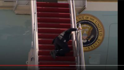 وخلال صعوده درج الطائرة تعثر الرئيس الأمريكي لكنه تمكن من الإمساك بحافة حماية السلم وواصل السير، لكن توازنه اختل مرة ثانية ثم ثالثة حتى سقط على ركبتيه. وإثر ذلك نهض بايدن بشكل سريع وصعد الدرج قبل أن يلقي التحية ويدخل إلى الطائرة.