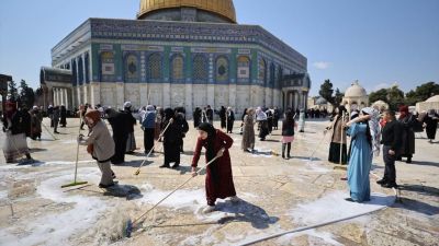 قام عشرات المقدسيين بعملية تنظيم للمسجد الاقصى المبارك وشرعو في ازالة اثار الاقتحام وتدنيس الجنود الاسرائيليين له تجهيزاً لاستقبال الوافدين لأداء الصلاة .