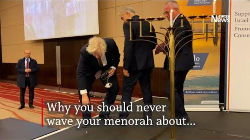 وكان رئيس الوزراء البريطاني بوريس جونسون يتحدث من على المنصة الى جانب الوزير الاسرائيلي في غداء العمل السنوي لأصدقاء المحافظين لإسرائيل حيث قدمت له هدية عبارة عن شمعدان، لكنه كسره بعد ثوان قليلة.