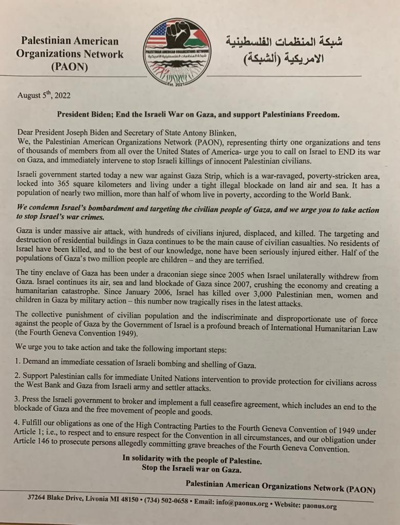 وطالب بيان المنظمات الرئيس الاميركي بايدن ووزير خارجيته توني بلينكن بالعمل فورا لوقف العدوان على غزة والتدخل الفوري لوقف العدوان الإسرائيلي وقتل المدنيين الفلسطينيين الأبرياء.