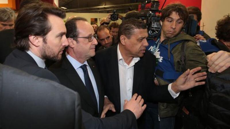 لكن الهدوء لم يستمر. فبعد ساعة من بدء الزيارة، هاجم مزارعون الرئيس بهتاف "استقالة"، كما ذكر مراسل لوكالة فرانس برس. وقال احدهم "انها حالة طوارئ لمربى الماشية" بينما ترددت هتافات "فاشل" و"لسنا مهاجرين" و"أحمق" و"نذل" وغيرها من الشتائم بينما كان هولاند يشق طريقه وسط مجموعة معادية من مربى الماشية. وهتف أحد المزارعين "أنه غير مكترث بنا".