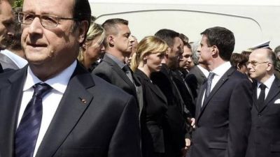 اظهر مقطع فيديو على الانترنت شرطيا فرنسيا يرفض مصافحة رئيس البلاد فرانسوا هولاند ورئيس الوزراء مانويل فالس، خلال الحفل تأبيني نظمته وزارة الداخلية لشرطيين قتلهما لعروسي عبد الله، أحد المبايعين لـ"داعش".