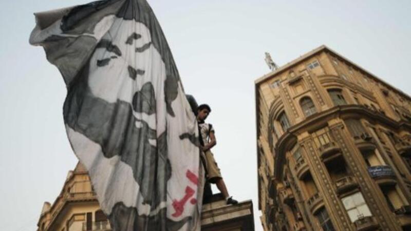 متظاهر ضد الحكومة يرفع علما كبيرا عليه صورة احد ضحايا التظاهرات الاخيرة في القاهرة/أ.ف.ب