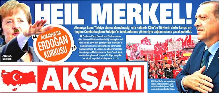 نشرت صحيفة "أكشام" التركية الثلاثاء، على الصفحة الرئيسية صورة المستشارة الألمانية، أنغيلا ميركل، بشارب أدولف هتلر، وبالتحية النازية.