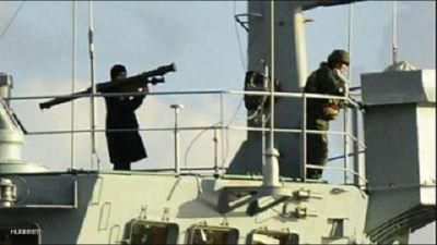 وعرض التلفزيون صورا لعسكري روسي على متن تلك السفينة وهو يحمل قاذف صواريخ على كتفه في وضعية الاطلاق.