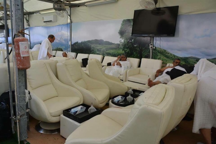 وفي مني والمزدلفة وعرفات، تتواجد خيم مكيفة وكراسي «ساونا ومساج» وأَسرة مجهزة لراحه رجل الأعمال، بالإضافة إلى الأطعمه المتنوعة.