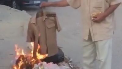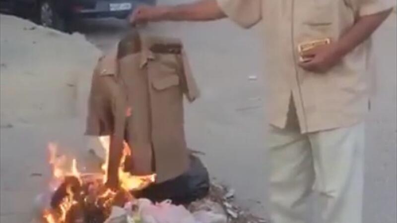 وفي المقطع المتداول؛ ظهر المواطن المسن وقد جمع بعض الأعشاب والأوراق، وأشعل بها النار، ثم رمى بزته العسكرية فيها، من غير أن يعلق ولو بكلمة.