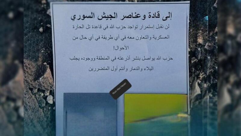 ووفق المنشور فانه موجه الى قوات الجيش العربي السوري النظامي وقالت فيه “لن نقبل استمرار تواجد حزب الله في قاعدة تل الحارة العسكرية والتعاون معه في أي طريقة في أي حالة من الأحوال”.