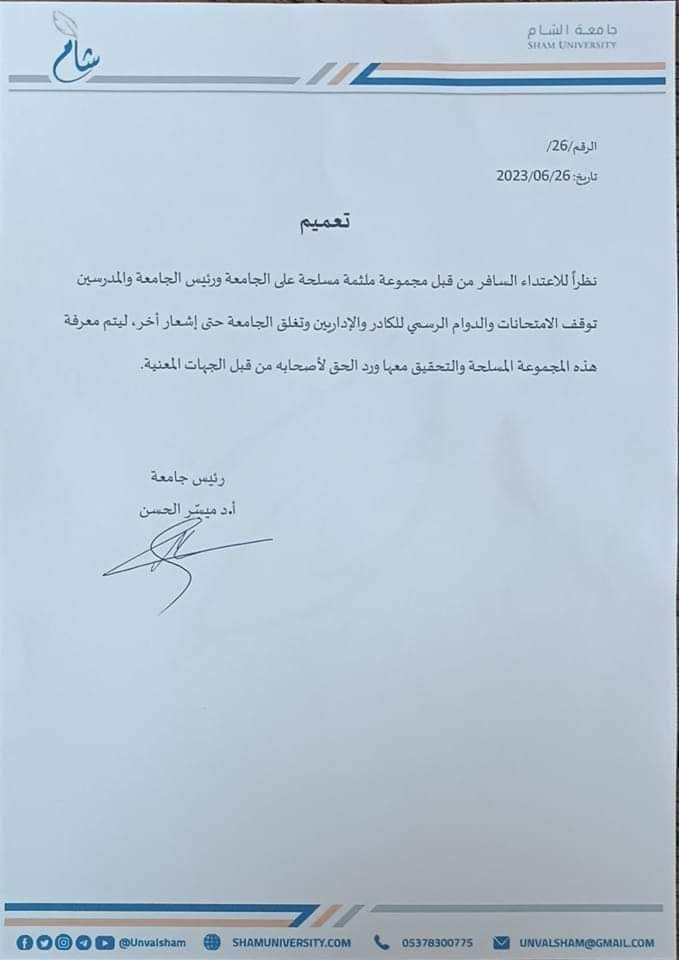 الطالب توجه للكادر التدريسي خلال الاعتداء بعبارات بينها "انا بشتريكم، وبدي أنجح غصباً عنكم"، فيما اُغلقت جامعة الشام حتى إشعار آخر..