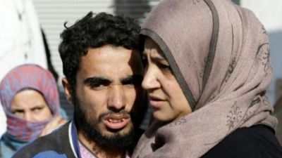 تقبل أم مناف (50 عاماً)، ترتدي معطفاً اسود اللون وتضع وشاحاً مرقطاً على رأسها، إبنيها بتأثر شديد. وتقول "الاثنان عادا، الحمدلله رب العالمين" قبل أن تضم مناف بقوة الى صدرها مرددة باللهجة المحكية "يا عمري إنت.. يا قلبي" وتعاود تقبيله وهي تحضن وجهه بكفيها.