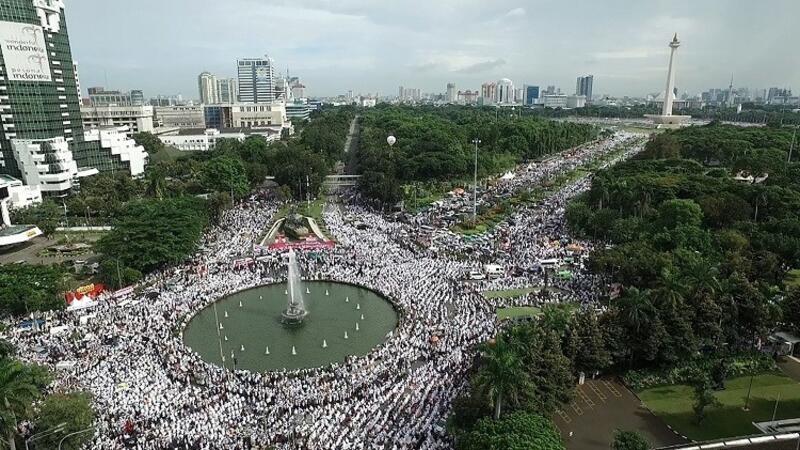 احتشد عشرات الآلاف من الإندونيسيين وسط العاصمة جاكرتا، الأحد 4 ديسمبر/تشرين الأول، داعين إلى التسامح والوحدة ردا على الاحتجاجات السابقة التي دعت إلى إقالة محافظ المدينة.