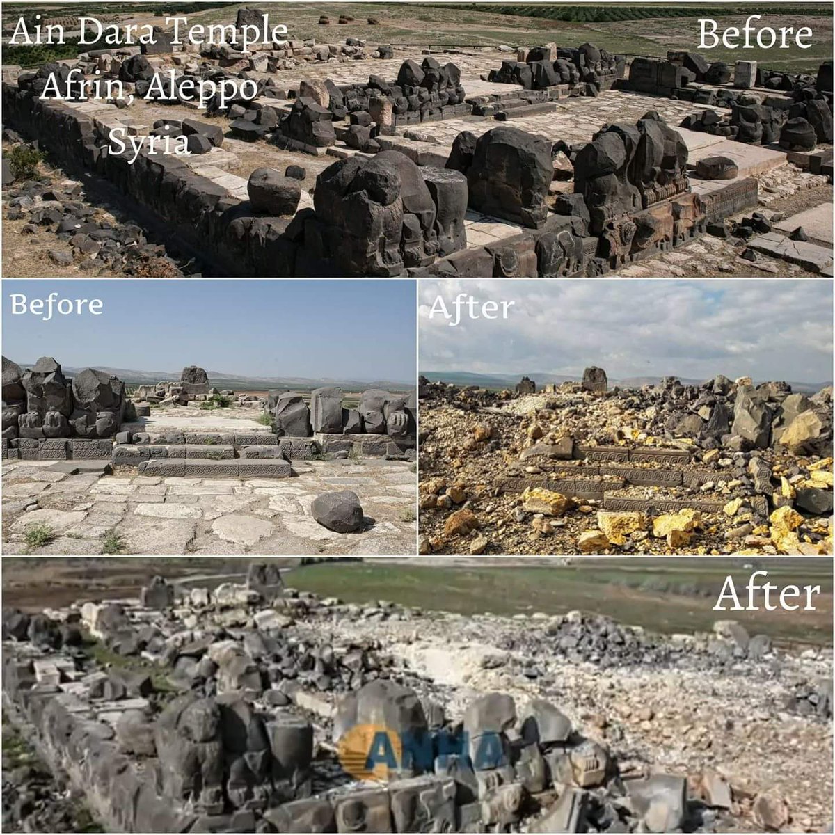 من جهة أخرى أكدت مصادر رسمية وتقارير إعلامية أن معبد عين دارة قرب مدينة عفرين والذي يعود تاريخه إلى آلاف السنين، دُمرت أجزاء منه جراء قصف القوات التركية.