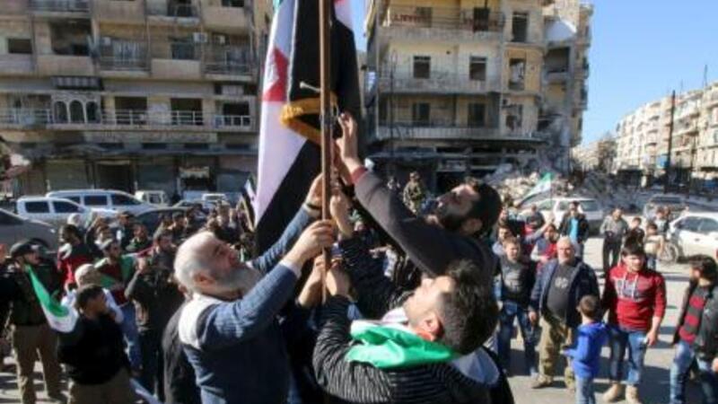 محتجون ينصبون علما للمعارضة السورية في حلب