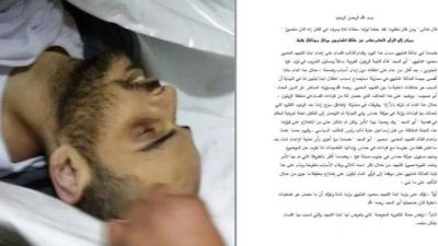اطلعت هيومن رايتس ووتش على الورقة المكتوبة دون علامات تنقيط، وفيها: "يا اخي حسام لقد عذبت عذاب شديد حتى كادوا ان يقتلوني قتلا حتى اعترفت لهم كذبا واعترفت على امور لم افعلها يوما في حياتي يا اخي فانا بريء".