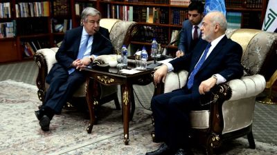 وأضاف غوتيريس: "نعمل ونساعد الحكومة العراقية في بناء المؤسسات وتقديم الخدمات المطلوبة للعراقيين"، وأبدى استعداده لدعم العراق وتبني القرارات الداعمة له في الأمم المتحدة وإنهاء آثار بعض القرارات التي شمل بها العراق بسبب النظام السابق والتعاون ودعم مقترح العراق الخاص بتجريم الفكر الإرهابي والعمل على منع انتشاره، موضحاً أن الأمم المتحدة ستستمر في خدمة العراق بمرحلة ما بعد القضاء على عصابات داعش الإرهابية وإعادة الإعمار وتقديم المساعدات بمختلف المجالات للعوائل النازحة والمساهمة في استقرار وازدهار العراق.