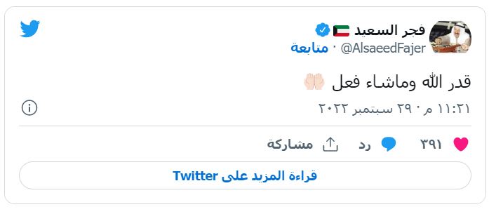 وقالت السعيد في تدوينة نشرتها عبر حسابها في "تويتر" عقب ساعات من إغلاق مراكز الاقتراع وبدء عمليات فرز أصوات الناخبين: "قدر الله وماشاء فعل" متراجعة عن العشرة الاوائل الذين سيمثلون الشعب الكويتي في دائرتها.