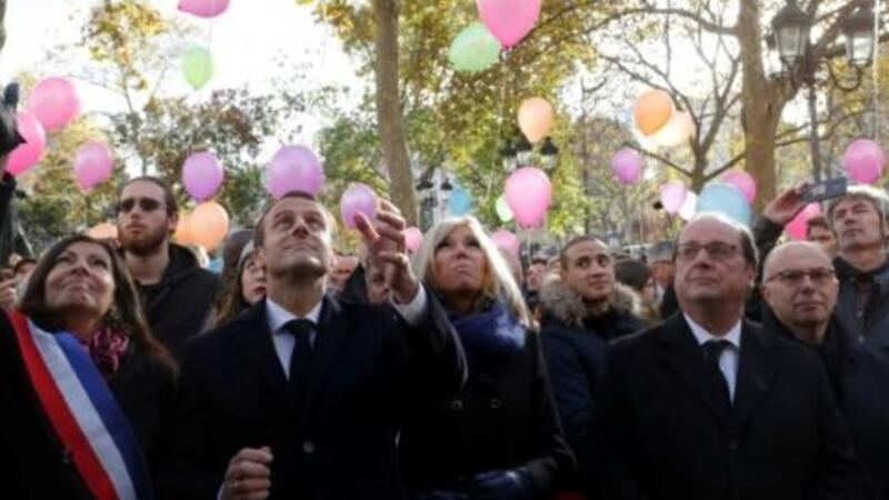 عمدة باريس اني هيدالغو، الرئيس الفرنسي ايمانيول ماكرون وزوجته بريجيت والرئيس الفرنسي السابق فرانسوا هولاند يطلقون بالونات ملونة تكريما لضحايا اعتداءات باريس
