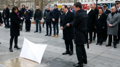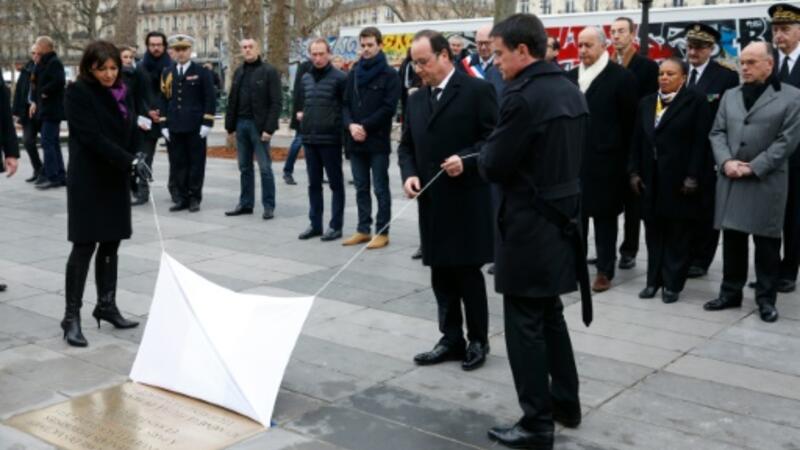 وقد كشف هولاند ورئيسة بلدية باريس آن ايدالغو قبل الظهر عن لوحة تذكارية عند اسفل شجرة سنديان زرعت لهذه المناسبة في ساحة الجمهورية، ويلي ذلك حفل موسيقي قصير يحييه المغني جوني هاليداي وكورس الجيش.