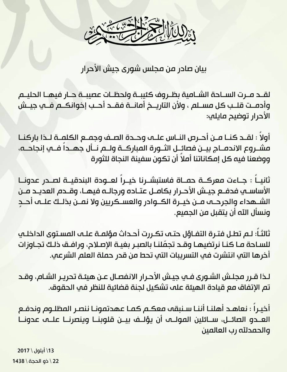 وأعلن "جيش الأحرار" أحد أكبر الفصائل العسكرية في "هيئة تحرير الشام"، الانشقاق عنها في بيان له أمس.