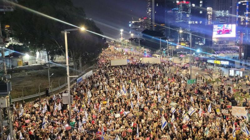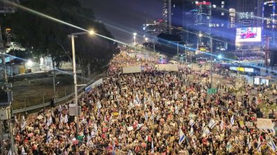 يتجمهر، في هذه الأثناء، ولليوم الثاني على التوالي آلاف المتظاهرين الإسرائيلين، أمام مبنى الكنيست، تعبيرا عن غضبهم من سياسية إدارة الحرب على قطاع غزة.