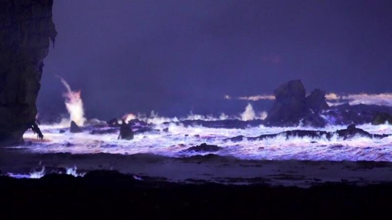 قد تبدو هذه أمواج ترتطم على شاطئ في كوكب آخر، تيارات النيون تشتعل بالضوء.